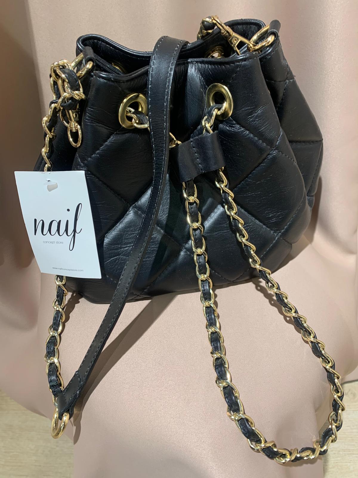 Bolso saco acolchado con detalles en dorado, asa larga.
