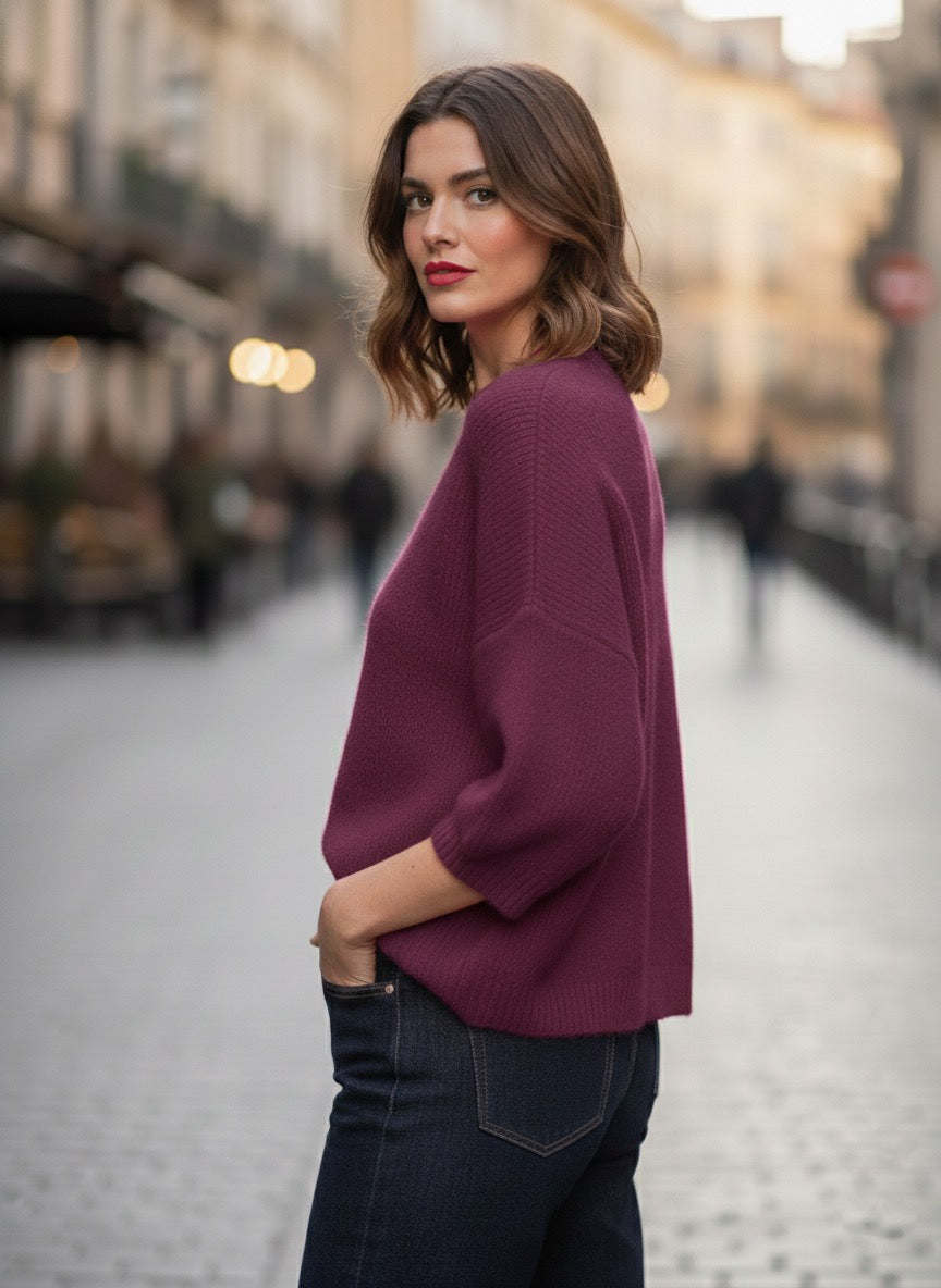 Color y Versatilidad para Todo el Año. Descubre el equilibrio perfecto entre tendencia y confort con nuestro jersey de punto de manga corta/tres cuartos. Su tejido suave y ligeramente abrigado es ideal para las estaciones de transición, aportando un toque de color y textura a tus conjuntos.