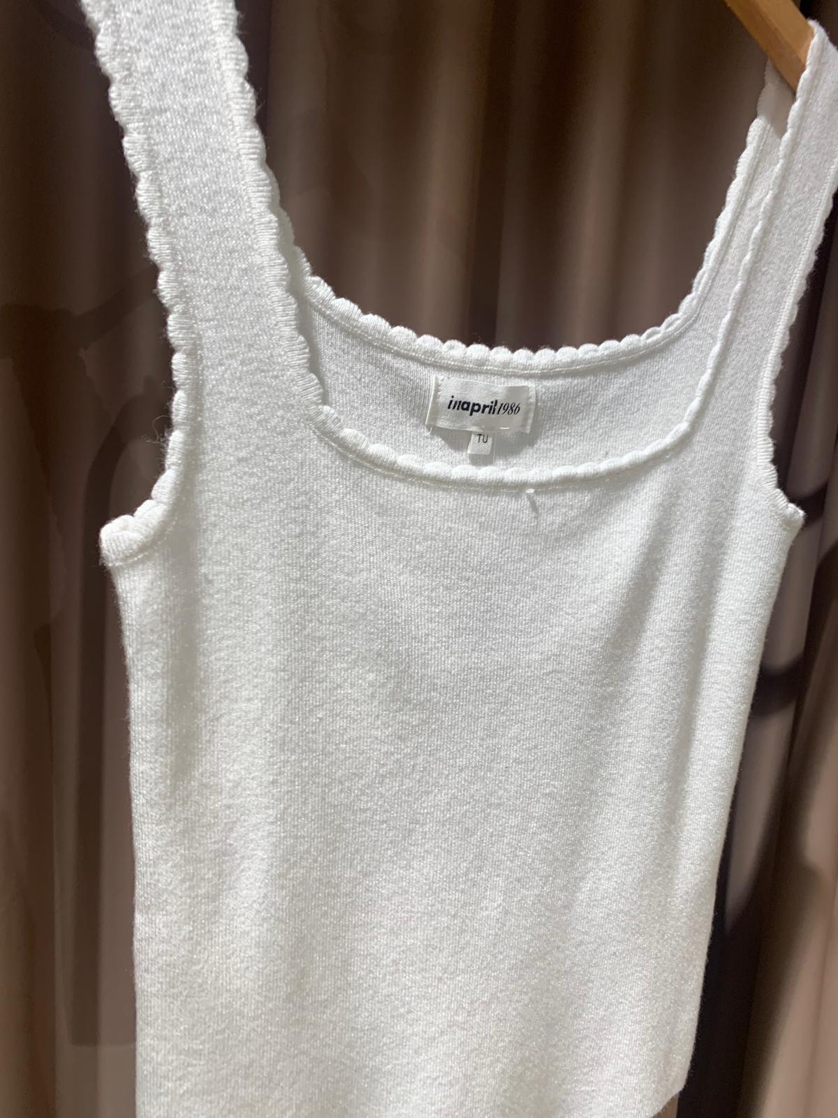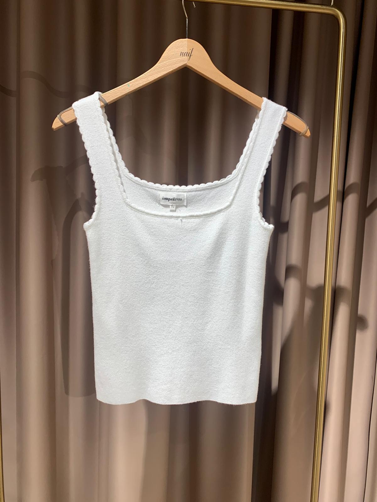 Tiene tirantes anchos, en el borde del escote y de los tirantes lleva un detalle ondulado.